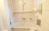 Łazienka razem z wc, z oknem. Wyposażona w wannę. Na ścianach i podłodze kafle.